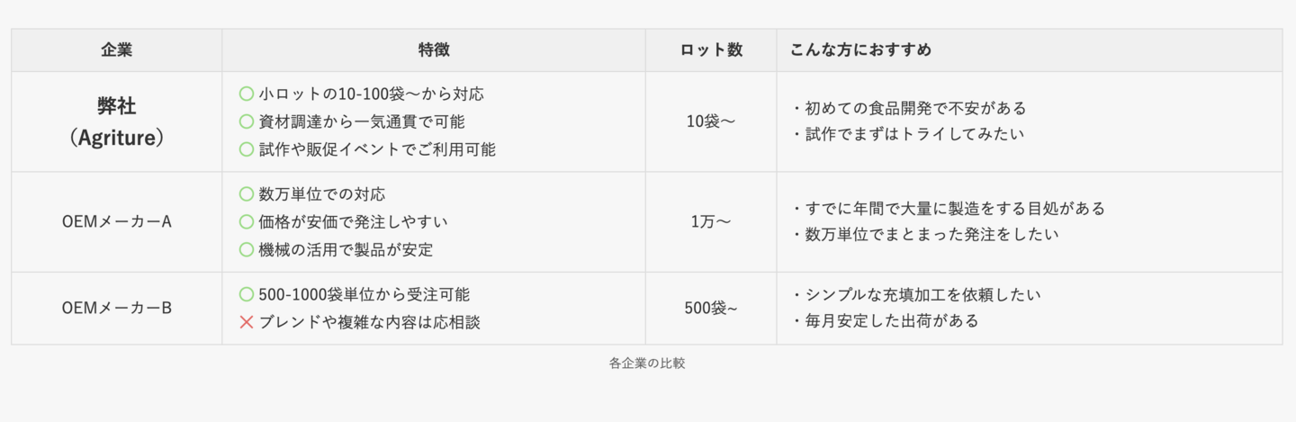 弊社でも乾燥野菜を原料とした、野菜茶のテスト販売を始める際に同様の壁にぶつかりロット数が多いことから充填加工を外部に依頼するのが難しいことがありました。Agritureは、乾燥野菜・パウダー原料の取り扱いを強みとする食品商社・OEMメーカーとして、こうした課題に応えるべく、小ロット充填に特化したサービスをスタートいたします。