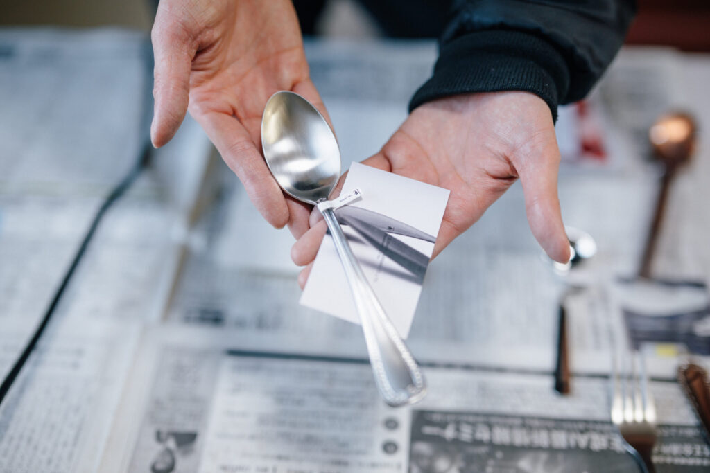 最大の特徴は、参加者自身が職人と同じ研磨機(バフ)を操作する最終仕上げの体験ができることです。回転する布製のやすり「バフ」にカトラリーを押し当て、表面を削って模様をつける研磨工程は、力加減や角度など長年の経験と感覚が求められる職人技の真骨頂。参加者はスタッフのレクチャーを受けながら研磨を体験し、世界に一つだけの「自分が磨いたカトラリー」を持ち帰ることができます。希望者には職人による検品も実施し、合格した製品には証のシールが貼られます。1911年に日本初の金属洋食器製造に着手した燕物産だからこそ提供できる、歴史と技術が凝縮された体験です。