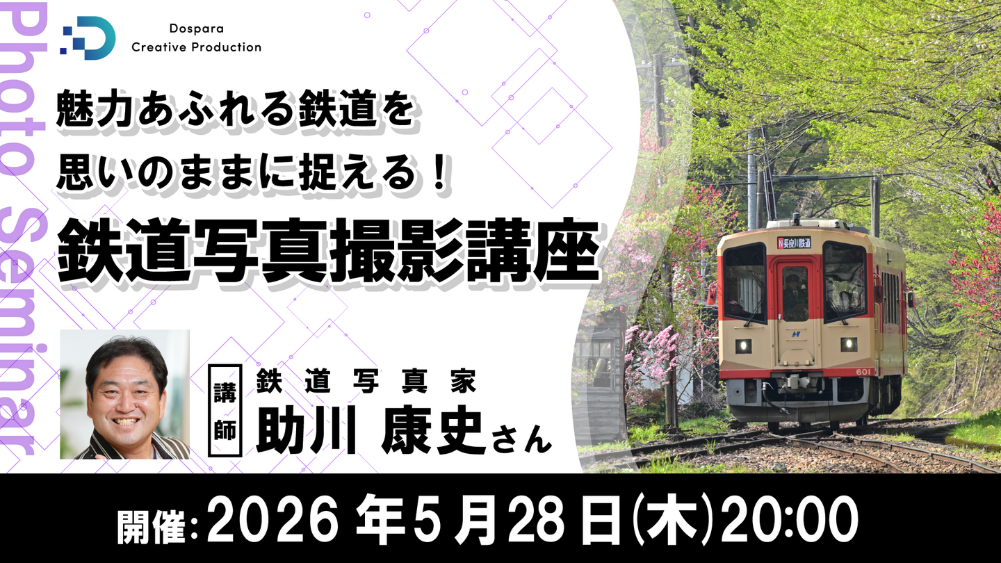 ドスパラは、鉄道写真家の助川康史氏を講師に迎え、『魅力あふれる鉄道を思いのままに捉える!鉄道写真撮影講座』を、2026年5月28日(木)20時よりオンラインで開催します。現在、参加者を募集しています。