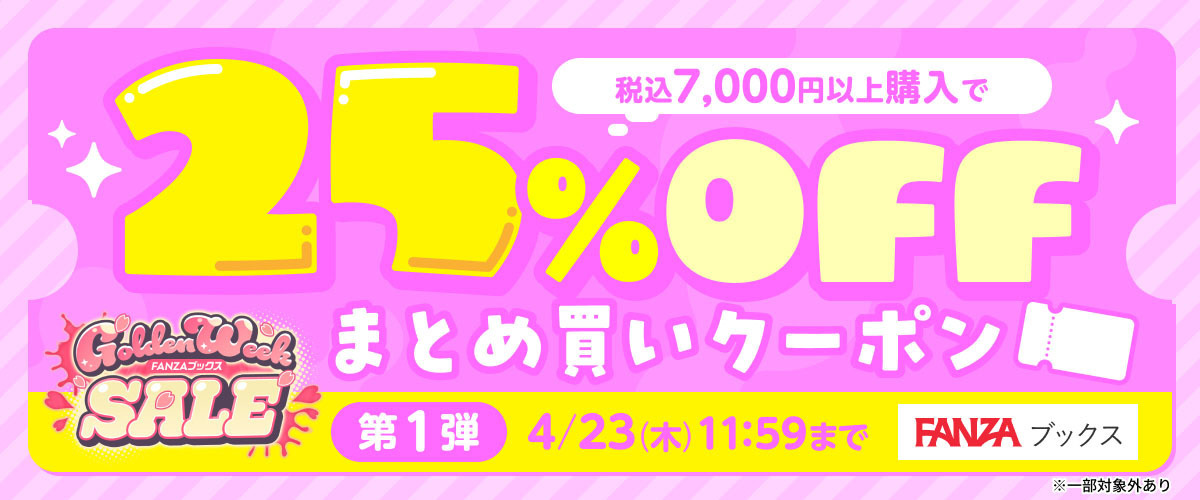 FANZAブックスGWセールと並行して、税込7,000円以上のご購入で使える25%OFFクーポンも配布いたします。1回あたり最大4,000円の割引となり、第1弾から第4弾までの合計4回のご利用で、最大20,000円相当の割引となります。(※クーポン利用対象外作品あり)