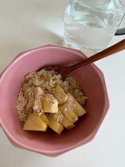 朝食は、腸内細菌の為のエサを意識して選ぶようにしています。腸内細菌は、私たちが摂取した食事をエサにするため、腸内細菌が好む栄養素である「ルミナコイド」を多く含む食品を積極的に取り入れています。また、特定の食材に偏るのではなく、1日を通して多様な食材を摂取することを意識しています。私のおすすめは、オートミールに青バナナ、グリーンキウイ、Lulumilkというルミナコイドが豊富に配合されたパウダーを組み合わせた朝食です。