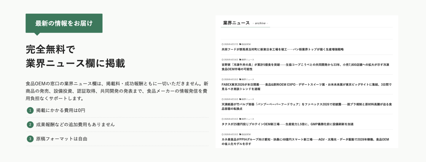 ¡Ö¿©ÉÊOEM¤ÎÁë¸ý¡×¤Ï¤³¤ì¤Þ¤Ç¡¢¿©Éʥ᡼¥«¡¼¤ÈOEM°ÍÍê´ë¶È¤ò¤Ä¤Ê¤°¥Þ¥Ã¥Á¥ó¥°¥á¥Ç¥£¥¢¤È¤·¤Æ±¿±Ä¤·¤Æ¤Þ¤¤¤ê¤Þ¤·¤¿¡£Æü¡¹´ó¤»¤é¤ì¤ëÁêÃ̤òÄ̤¸¤Æ¡¢Ãæ¾®¿©Éʥ᡼¥«¡¼¤¬¾ðÊóȯ¿®¤Îµ¡²ñ¤ò¶¯¤¯µá¤á¤Æ¤¤¤ë¤³¤È¤ò³Îǧ¤·¤¿¤³¤È¤«¤é¡¢¶È³¦ÆÃ²½¤Î¥Ë¥å¡¼¥¹¥ê¥ê¡¼¥¹·ÇºÜÁë¸ý¤ò¿·¤¿¤ËÀ°È÷¤·¤Þ¤¹¡£
